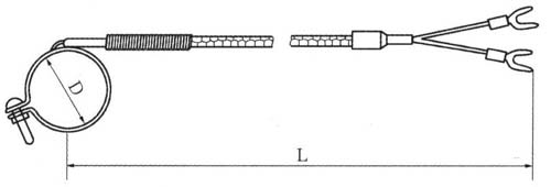 名稱 型號 分度號 測量范圍(℃) 抱箍材質 抱箍直徑D(mm) 導線長度L(mm) 抱箍式熱電偶熱電阻 WRNT-04 K 0~400 1Cr18Ni9Ti Φ50~Φ100 1000~4000或根據用戶要求協議訂貨 WRET-04 E WZPT-04 Pt100