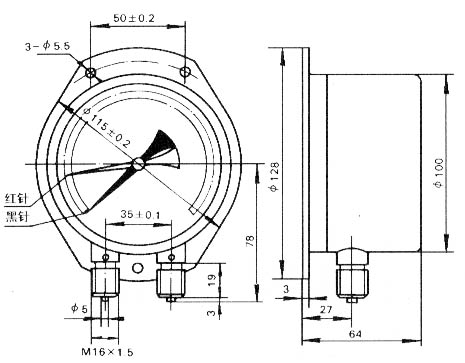 YZS-102系列雙針壓力表的工作原理是基于彈性元件(測(cè)量系統(tǒng)中的彈簧管)的彈性變形。即在被測(cè)介質(zhì)的壓力作用下,迫使兩彈簧管之末端各自產(chǎn)生相應(yīng)的位移,借助于拉桿經(jīng)此輪傳動(dòng)機(jī)構(gòu)的傳動(dòng)并予放大,由固定于此輪軸上的紅、黑指針將兩個(gè)被測(cè)值分別在刻度盤(pán)上指示出來(lái)。